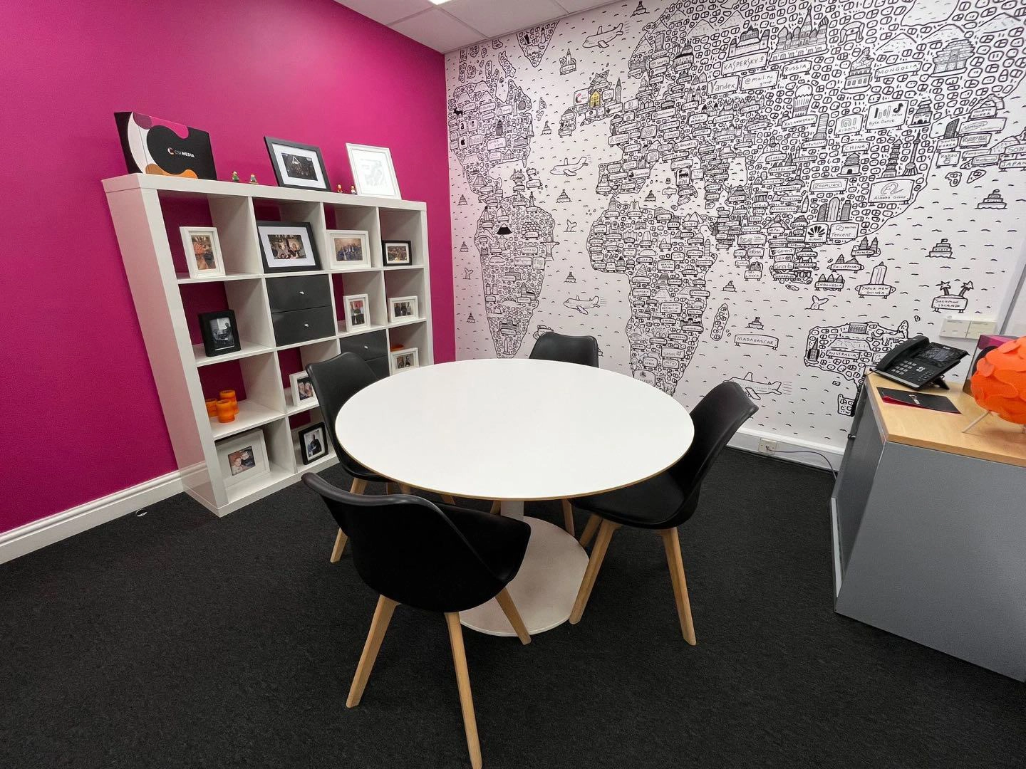 A modern, polished meeting room featuring a stunning wall-length artwork of the local area by a renowned artist. Fully equipped with all the essentials: large meeting table, comfortable seating, high-speed WiFi, presentation screens, and everything you need for productive sessions. You also have convenient access to a kitchen and toilets, making it ideal for client meetings, workshops, training sessions, or team planning days.